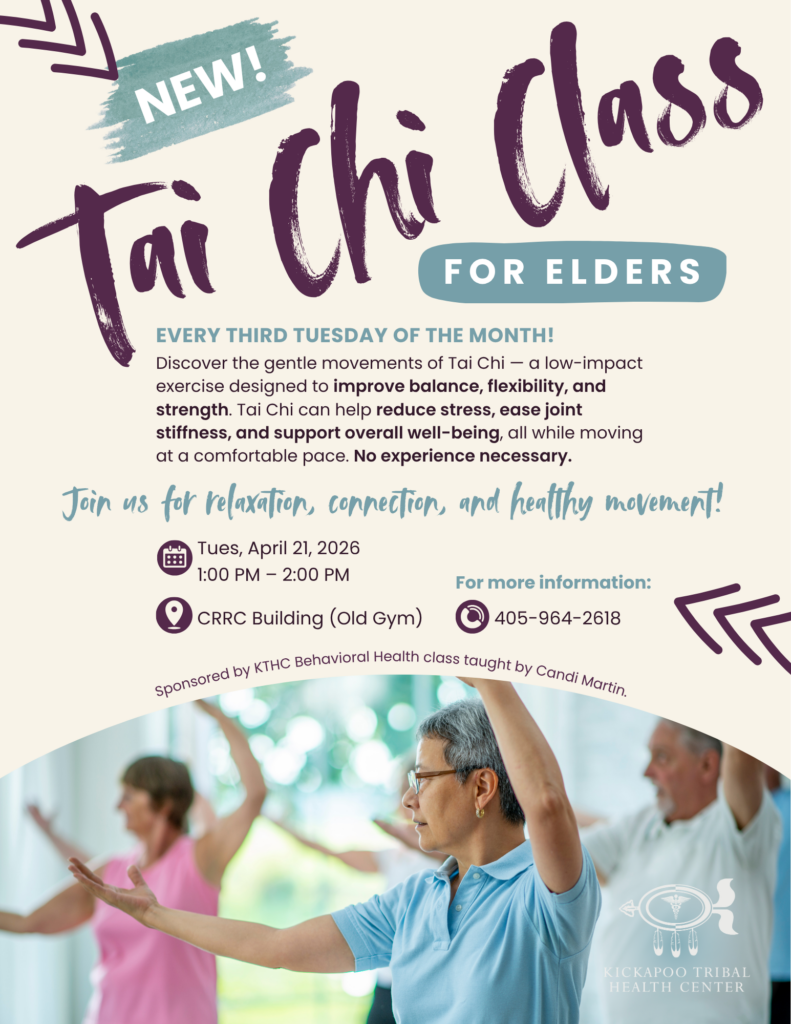 Tai Chi Class for Elders Posted on March 27, 2026March 27, 2026 by okkthc Join us for relaxation, connection, and healthy movement! Tuesday, April 21, 2026 • 1:00 PM – 2:00 PM • CRRC Building (Old Gym) Share this: Print (Opens in new window) Print
