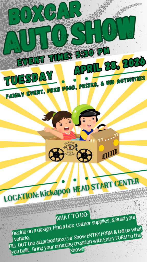 Kickapoo Head Start Boxcar Auto Show Posted on April 13, 2026April 13, 2026 by okkthc EVENT TIME: 5:30 PM • TUESDAY APRIL 28. 2026 • FAMILY EVENT. FREE FOOD, PRIZES. & KID ACTIVITIES Share this: Print (Opens in new window) Print