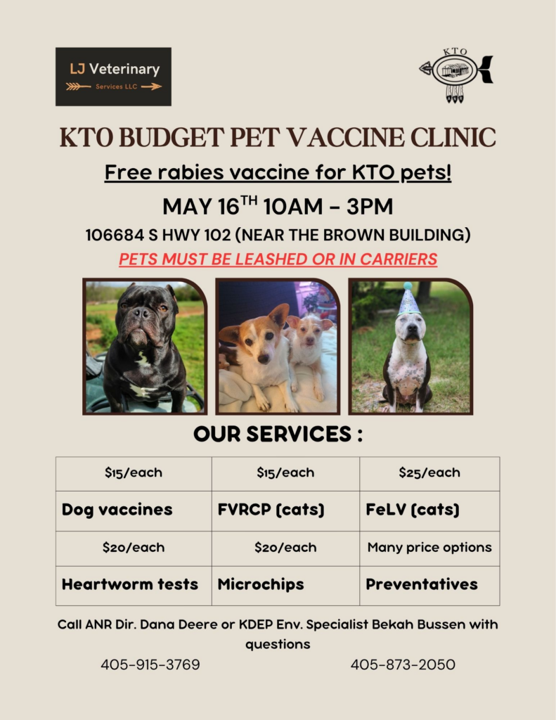 KTO Budget Pet Vaccine Clinic Posted on April 27, 2026April 27, 2026 by okkthc Open to All • Free Rabies Shots for KTO Tribal Member Pets • Saturday May16th, 2026 10am-3pm Share this: Print (Opens in new window) Print